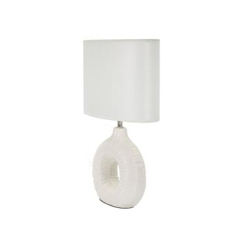 Lampada da comodino con base bianca, dal design elegante con un singolo foro centrale e decorazioni simili a drappeggi che aggiung...