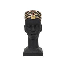 Elegante scultura nera con finiture dorate a forma di regina degli scacchi.