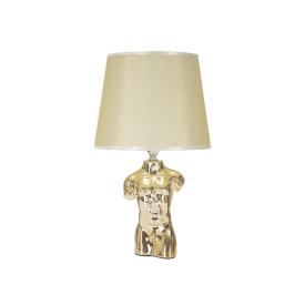 Lampada da tavolo in ceramica dorata a forma di busto di uomo. completa di paralume in tessuto beige.