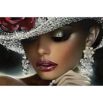 Dipinto su tela completo di telaio in legno raffigurante un volto di donna con copricapo completo di eleganti applicazioni in tess...