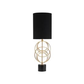 Elegante lampada da tavolo in stile glam in metallo con decorazioni metalliche nere e paralume in tessuto nero. il design lineare ...