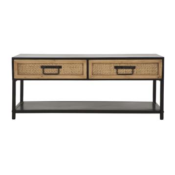 Mobile portatv con struttura e ripiano in metallo nero con 2 cassetti in legno dalla lavorazione che richiama gli intrecci del rat...