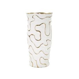 Elegante vaso in resina dorata con finiture bianche dalle linee morbide e sinuose.