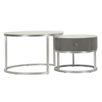 Tavolinetto in metallo argentato con base a linee intrecciate, che si uniscono con eleganza. il top in marmo, con le sue venature ...