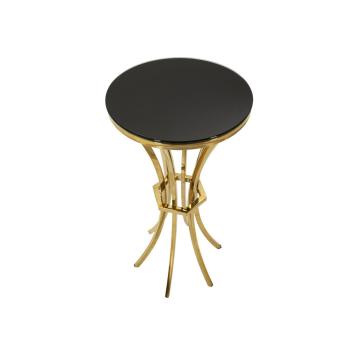 Tavolinetto rotondo in metallo nero con gambe dorate. la parte superiore è finemente intagliata per donare un tocco di eleganza. ...