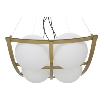 Lampadario in metallo dorato dalle linee geometriche con 4 punti luce in eleganti sfere di vetro bianco.