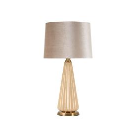 Lampada da tavolo con 2 punti luce in metallo dorato dalle linee semplici ed essenziali, impreziosita da eleganti paralumi in vetr...