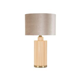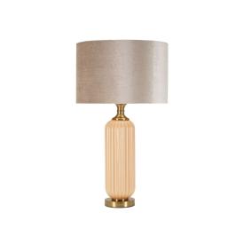 Elegante lampada da tavolo in stile glam in metallo dorato e paralume in tessuto rosa. i decori metallici dalle linee geometriche ...