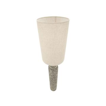 Lampada da tavolo in ceramica bianca e dorata dal design morbido e sinuosocon eleganti fori. completa di paralume in tessuto bianc...