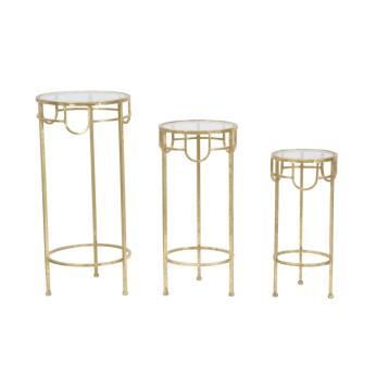 Coppia di tavolinetti rotondi in metallo e vetro con decorazioni a forma di foglie. le linee semplici unite alle particolari decor...