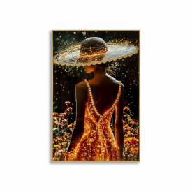 Dipinto su tela completo di telaio in legno e cornice in metallo oro con una donna che indossa un grande cappello con fiore, espr...