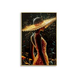 Dipinto su tela laccato con cornice dori incarna fascino e mistero. la figura femminile, avvolta in un elegante abito nero e un ca...