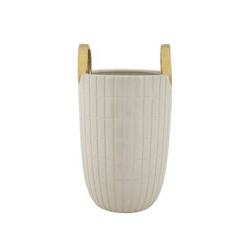 Vaso in ceramica bianca con eleganti quadretti in rilievo, impreziosito da due anelli dorati.