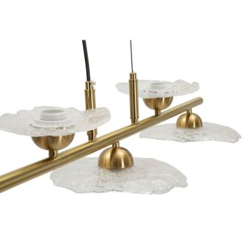 Lampadario in metallo dorato con 2 punti luce dalle linee semplici ed essenziali, impreziosito da eleganti paralumi in vetro con d...