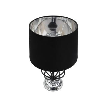 Elegante lampada da tavolo in stile glam in metallo con decorazioni metalliche nere e paralume in tessuto nero. il design lineare ...