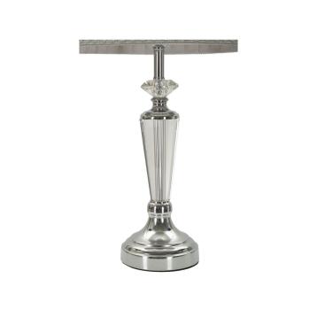 Elegante lampada da tavolo in metallo argentato e vetro. completa di paralume in tessuto grigio con finiture grigio scuro.