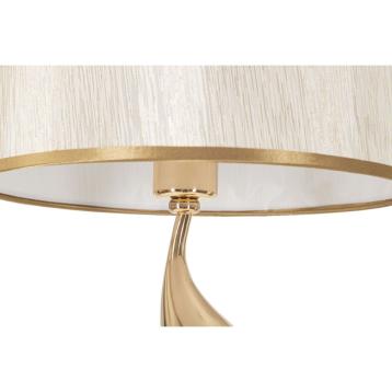 Lampada da tavolo in metallo dorato con 2 punti luce e paralume composto da piume rosa.