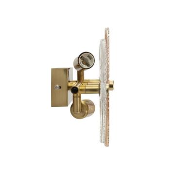 Lampadario in metallo dorato con 2 punti luce dalle linee semplici ed essenziali, impreziosito da eleganti paralumi in vetro con d...