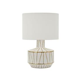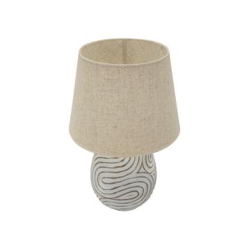 Lampada da tavolo in resina con eleganti decorazioni floreali in rilievo. completa di paralume in tessuto bianco.