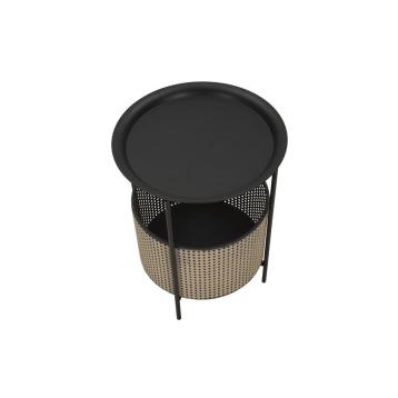 Tavolinetto rotondo in metallo nero con gambe dorate. la parte superiore è finemente intagliata per donare un tocco di eleganza. ...