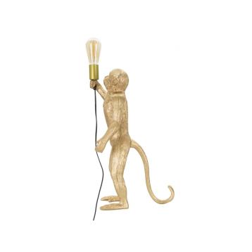 Lampada da tavolo in resina a forma di scimmia in piedi con in mano la lampadina.