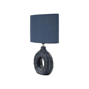Lampada da comodino con base blu, dal design elegante con un singolo foro centrale e decorazioni simili a drappeggi che aggiungono...
