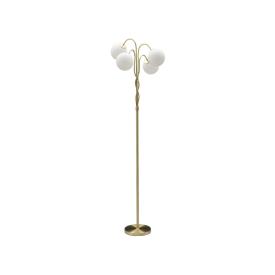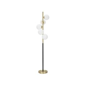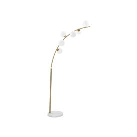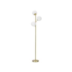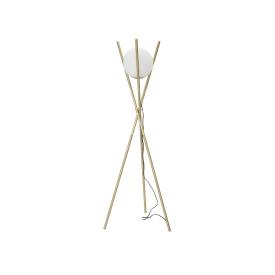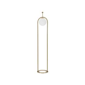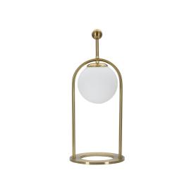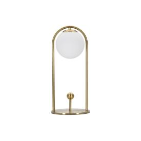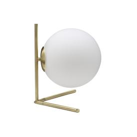 Lampada da tavolo in metallo dorato dalle linee semplici con elegante sfera paralume in vetro bianco.