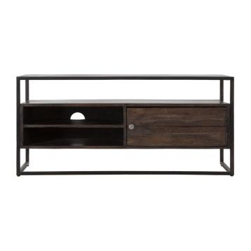 Mobile porta tv in legno massello di acacia con 3 ripiani e anta incorniciato in una struttura in metallo nero dalle linee pulite ...
