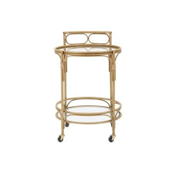 Carrello rotondo in metallo con finiture in rattan completo di 2 ripiani in vetro e pratiche rotelle con freno.