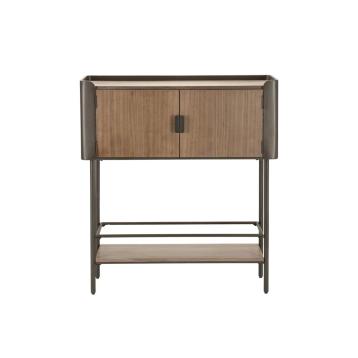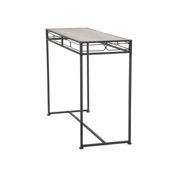 Console rettangolare in metallo nero con foglie decorative e piano in legno marrone.