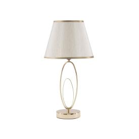 Lampada da tavolo in metallo dorato dalle linee semplici con elegante sfera paralume in vetro bianco.