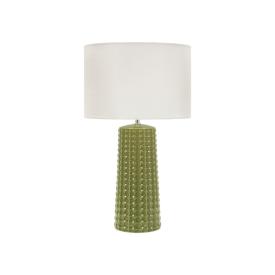 Lampada da tavolo in resina con eleganti decorazioni lineari in rilievo. completa di paralume in tessuto beige.