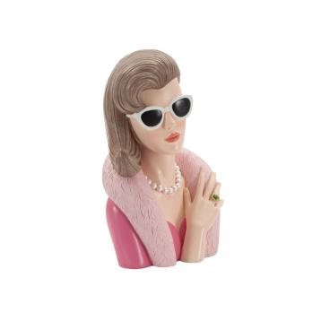 Statua a forma di testa di donna con copricapo e gioielli ispirati alla tradizione delle tribù primitive.