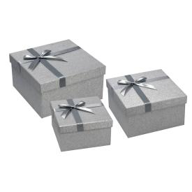 Set 3 scatole natalizie quadrate in cartone con nastro argento 16x16h9,5cm-19x19h10,5cm-22x22h12cm