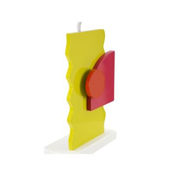 Lampada da tavolo in legno composta da figure che richiamano l'arte futurista. completa di paralume in tessuto arancio.