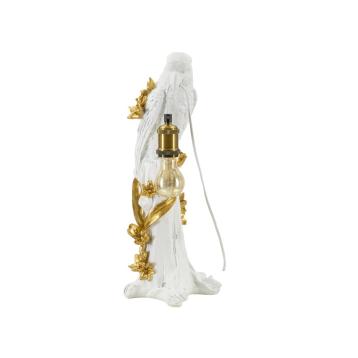 Lampada da tavolo in resina a forma di pappagallo impreziosito da eleganti decorazioni dorate.