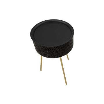 Tavolinetto rotondo in metallo nero con gambe dorate. la parte superiore è finemente intagliata per donare un tocco di eleganza. ...