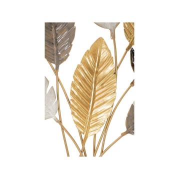 Pannello decorativo 3d da parete in metallo composto da rami e foglie dorate con fiori bianchi e dorati.