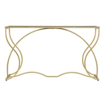 Elegante console in metallo dorato con ripiano in vetro temprato nero dalle linee morbide e sinuose. eleganza e design si fondono ...