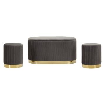 Panca contenitore e due sgabelli in velluto grigio plissettato con base dorata. raffinato e discreto, è perfetto per donare elega...