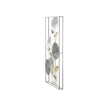 Pannello decorativo 3d da parete in metallo composto da foglie e fiori in un'elegante cornice rettangolare.