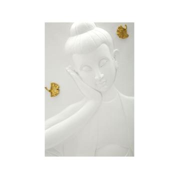 Pannello decorativo 3d da parete in resina raffigurante buddha in rilievo con eleganti foglie decorative dorate.