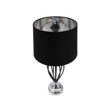Lampada da tavolo in metallo dorato dal particolare design lineare impreziosito da sfere decorative e paralume in tessuto nero.