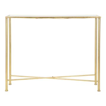 Console rettangolare in metallo dorato con piano in vetro a specchio dalle linee semplici ed essenziali.