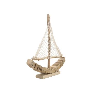 Scultura di barca a vela in legno con base. la vela è realizzata con una rete in tessuto mentre lo scafo è realizzato con piccol...