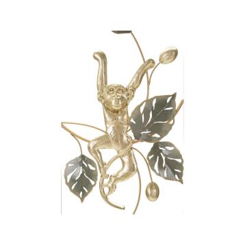 Pannello decorativo 3d da parete in metallo composto da una scimmia dorata su rami con foglie verdi in un'elegante cornice rettang...
