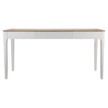 Tavolo da pranzo rettangolare in legno bianco dalle linee semplici ed essenziali con piano in legno marrone.
