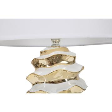 Lampada da tavolo in ceramica bianca e dorata dal design che richiama un alveare. completa di paralume in tessuto bianco.