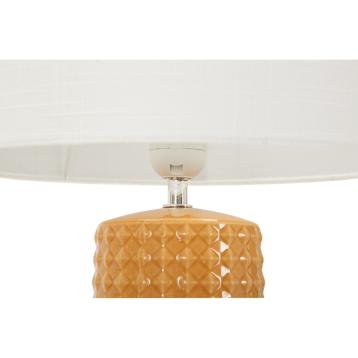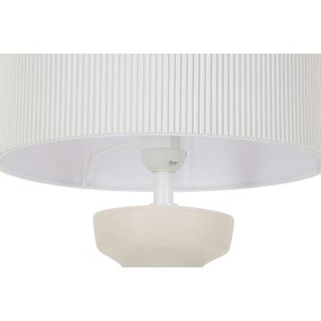 Lampada da tavolo in ceramica bianca e dorata dal design morbido e avvolgente. completa di paralume in tessuto bianco.
