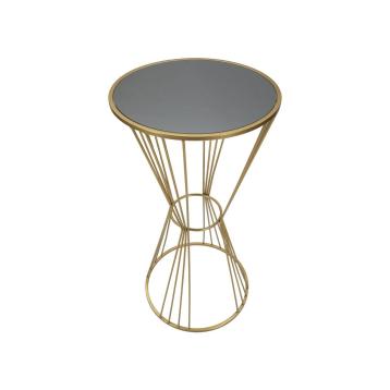 Tavolinetto rotondo in metallo dorato dalla struttura semplice e dalle linee essenziali con piano in vetro a specchio.